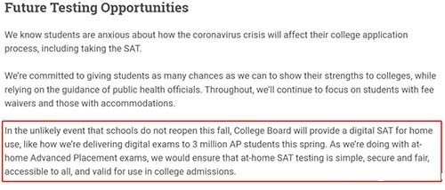 ② 如果今年秋季学期仍然不能开学,College Board将提供和AP一样的可以在家考的SAT考试,CB也将确保在家进行的SAT考试公平公正公开,并且能够用于申请大学。