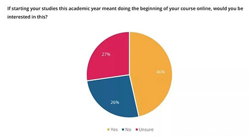 对于网课的形式,同学们的接受度还是比较高的。在本次报告中也有做提及,根据学生的调查反馈,46%的受访者更倾向于学校采纳网课的形式,而不是增加教学空间来避免疫情传播。