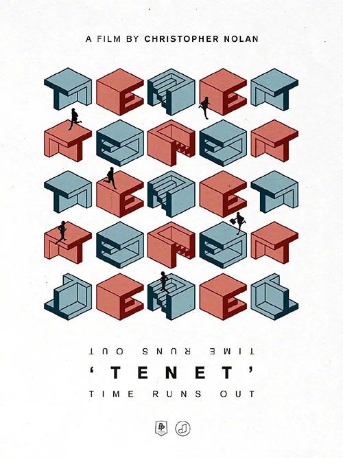 电影名称“TENET”的每个字母,分别设计成单独的立体小空间,而人物以剪影的形式穿梭在其中,暗示了影片中主角在不同空间里来回穿梭的画面。