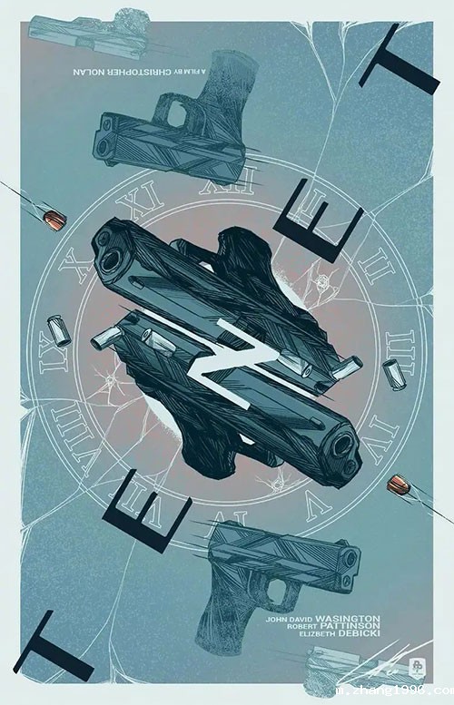 另外一款海报也是以“TENET”为主要表达元素,以蓝色系为主色调的插画,通过将手枪作为主要表达元素。