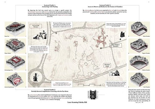 我试图以碎片化的形式修复还原再现这篇场地的历史景观,并对遗址遗产做出具有经济可持续效益的现代化回应。通过延伸公元4世纪存在于Fabrika的采矿场遗留下的stone cut line和建立刚挖掘不久的考古遗迹buffer circle,继而形成不对原场地历史要素造成干扰的步行路径,达到对场地遗产的充分尊重。