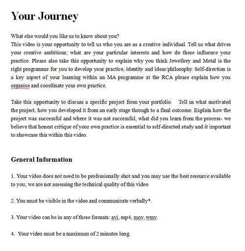关于视频的具体要求,可以参考上图官网给出的具体描述,最重要的是理解RCA要求学生提交视频的目的。视频内容一般以自我介绍+创作过程为主,在视频中清晰的描述自己的创作起点、思维专业、设计理念和实现过程等等。