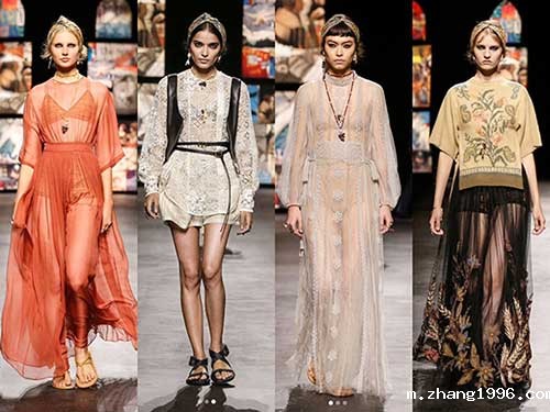 极具浪漫情怀的Dior仙裙也没有缺席此次的大秀。雪纺纱裙配上带有民族特色的珠式刺绣。而那些柔软的针织衫和镂空的印花,再配上优雅的颜色。