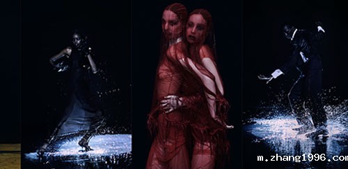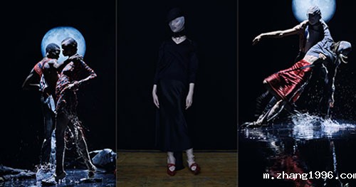 在黑夜的水中,飘然起舞,服饰被水淋湿交融,然后溅起水花。这场大秀就像是一场令人回味的戏剧表演。