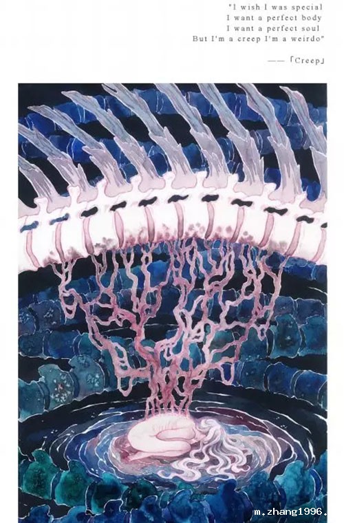 下面的两张图是我的自画像项目中“Spine”部分的过程和成稿,《Creep》这首歌激起了我身体里“自卑 ”那一部分的共鸣,可我不知要怎么把音乐带给我的情绪转换为图像,而图中就是我最终学到的东西。