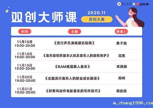 2020双创大赛线上大师课,特邀5位音乐业界大咖,从音乐演唱、音乐版权、音乐文化、音乐创意创业、影视音乐五个方面带领大家对音乐行业做更深层次、更专业的观察和剖析。