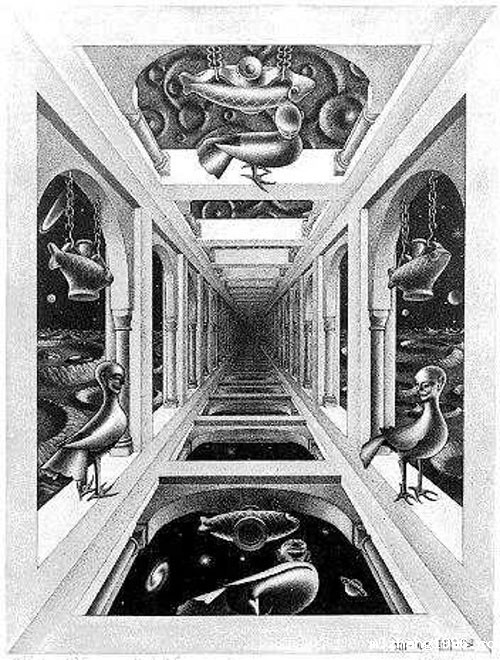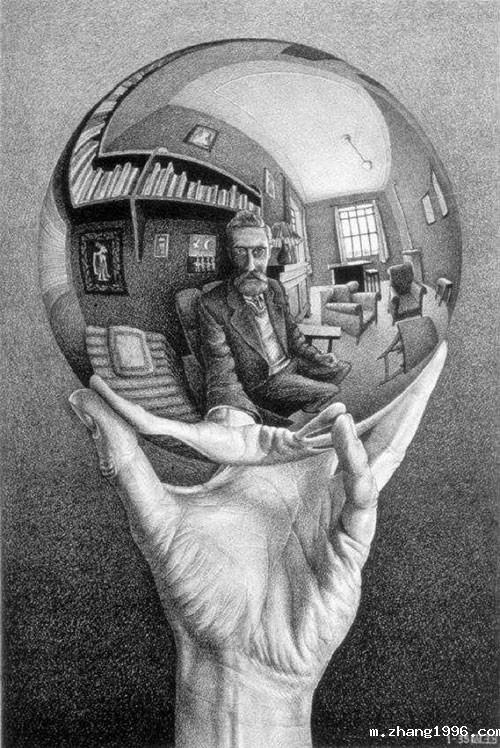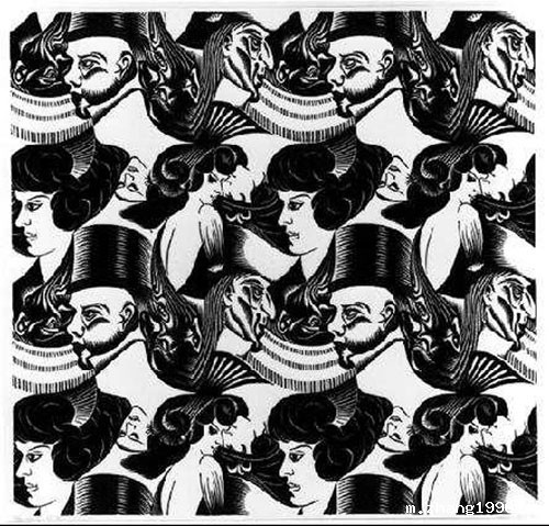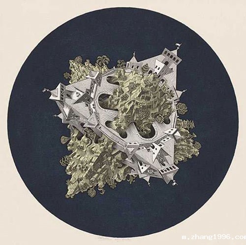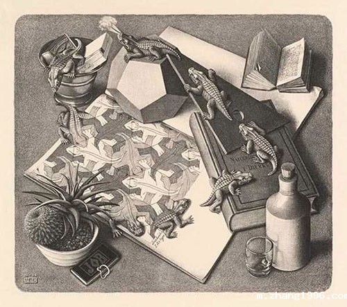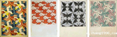 埃舍尔作品的主要特征:二维与三维之间、写实场景与抽象镶嵌之间,以及几何图形和具象图形之间的渐变。