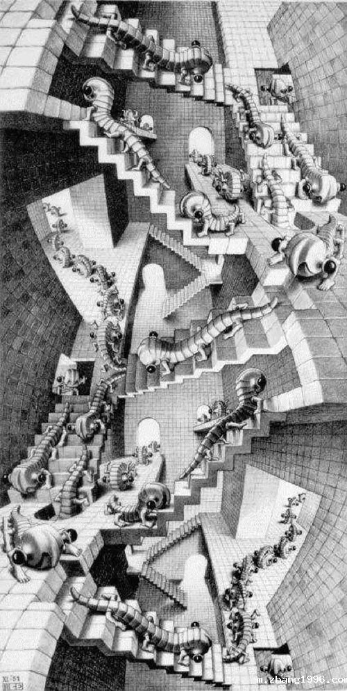 随着时间的推荐,埃舍尔的作品不再只是二维图形上的变化,也在渐渐向三维空间推进,这幅是最著名的关于二维三维变换的作品。