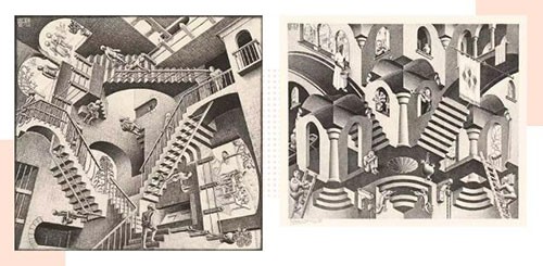 左图:《相对论》,石版画,1953;右图:《凸与凹》,石版画,1955