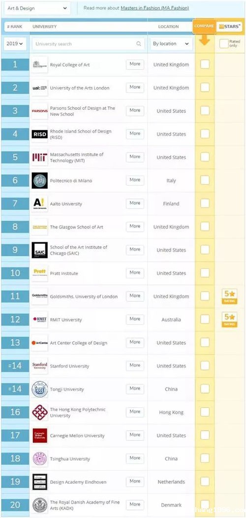 QS每年会根据学术声望、教职员论文引用数、师生比例、雇主声誉、国际教师比例和国际学生比例来评定每所院校的排名情况。2019年QS全球艺术设计类排名,伦敦艺术大学来到第二位。
