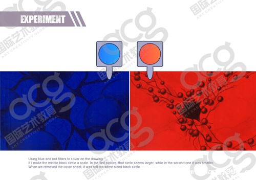使用蓝色和红色过滤器覆盖图纸。如果我让中间的黑色圆圈成为一个比例。 在第一张照片中,该圆圈看起来更大,而第二张则更小。当我们移除封面时,它仍然是相同大小的黑色圆圈。