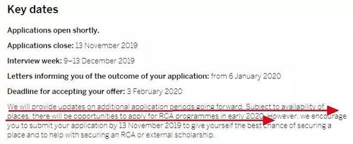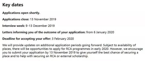 我们今后将提供更多关于申请时间的更新,视情况和名额而定,2020年初将有机会申请RCA。但是,我们建议您在2019年11月13日之前提交申请,以最大程度地预定自己的位置,并确保能申请RCA外部奖学金。
