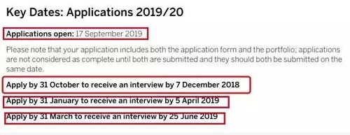 去年,RCA的申请开放时间是9月17日,递交申请的截止时间分三次。而熟悉的同学都知道,相比去年,今年的申请截止时间是提前了。皇艺去年第一批的截止时间是10月31日,第二批是1月31日,第三批是3月31日,面试时间分别为12月7日、4月和6月25日。