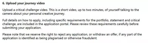 所有专业的作品集要求统一变为至多5张图片或是视频,同时呢,需要另外附加上传一个关于自己创作心路历程的两分钟视频。并且特别强调,如果在这些材料当中有任何内容被认定为欺诈或剽窃,将保留拒绝申请或撤回要约的权利。
