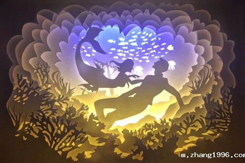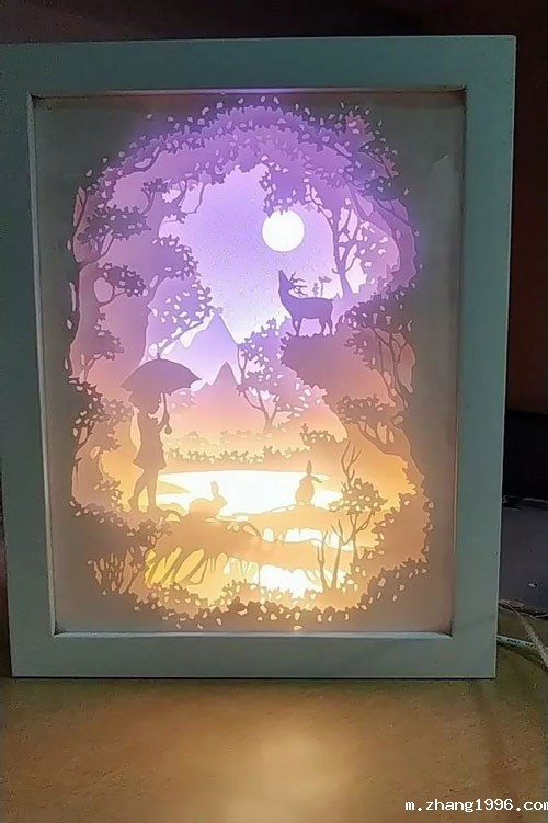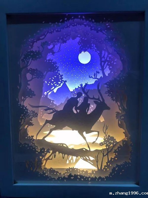 前面是精致的纸雕,后面打入一束灯光,暖黄色的灯光透过一层层剪影,呈现出童话里的画面,匠心独运的设计,精心打磨的细节,让人可以透过层次和光影感受到美。