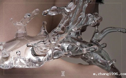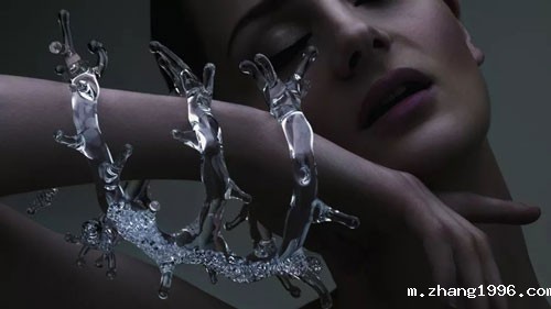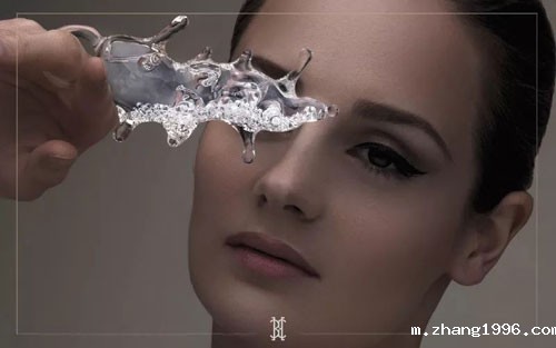 Beau:当时其实为了研究如何让水元素更加灵动,创造了一种水晶和玻璃的结合材质,过程首先是用高速摄影定格水泼向身体的一瞬间,产生一个2d的画面,然后我用2d图像转化成3d,再倒膜用有机水晶复制定型成珠宝,最后珠宝再经过拍摄,又成为一个2d的东西,其实过程下来就是不停的2d和3d之间的转化,以求达到最灵动的水的效果,这个过程其实是很美丽的。