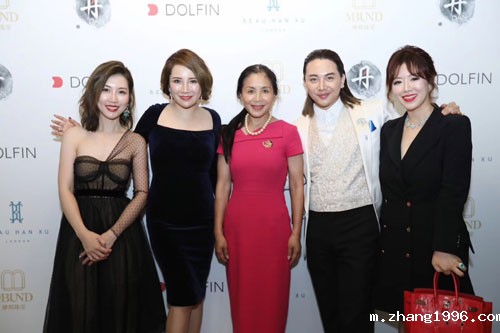 2017,伦敦。在Splash和Drop两场发布会上,无数奢侈品牌齐齐助阵,图为LVMH 市场总监 Noura Nati (左二)、LV 私人客户经理 Najat Dati(左三)、迪拜皇室私人医生 Dr. Mo,宾客手中拿着Beau Han Xu发布会上的的伴手礼。