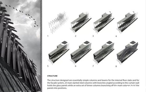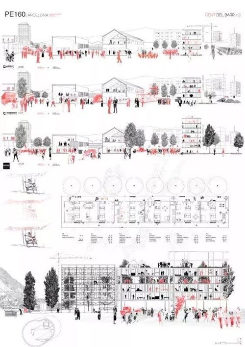 分析图和轴测图或者其他图纸无法在一页当中分别罗列,那就可以考虑重叠式的排版,即底图为满铺的效果图或者轴测图,在其上方空白处叠加分析图和其他补充说明的内容(文字)。如果图片颜色较浅,文字和补充图的色调选择深色;若图片颜色较深,则反之。