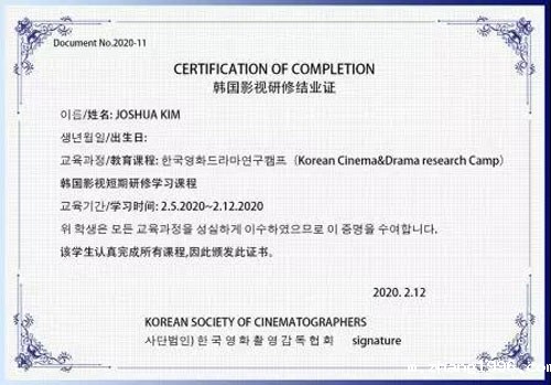 收获一张结业证——获得韩国摄影导演协会颁发的实践证书;