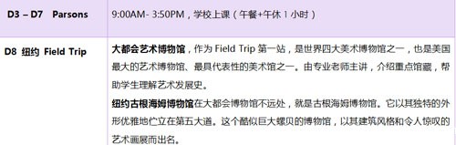 夏校课程的时长是两个星期学习一门课程,包括室内学习和校外采风,帕森斯位于纽约繁华地段,周边采购学习用具和服装面料都非常方便,教学楼里还有打印机,可以随时打印作业。两个星期的学习,可以让学生很深入的学习到大量相关知识。