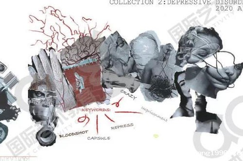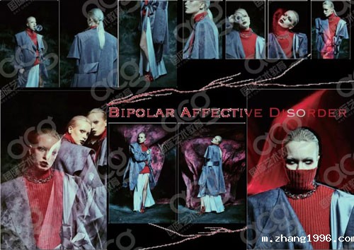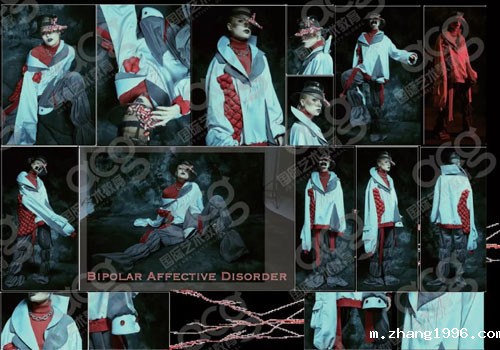 这个项目是想让人们了解和接受现实生活中的痛苦,在面料和印花的选择上面来表现主题,比如天鹅绒比鹿皮便宜一些,但是质感差不多,是一种很高档的感觉,硬挺,体现出一种压力,不放松的感觉,大面积的用了这种材质。