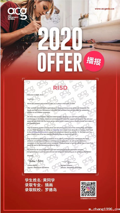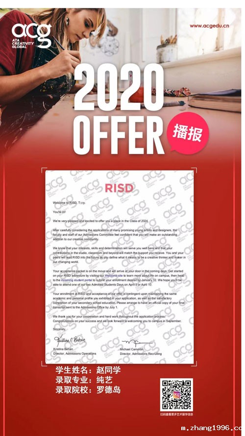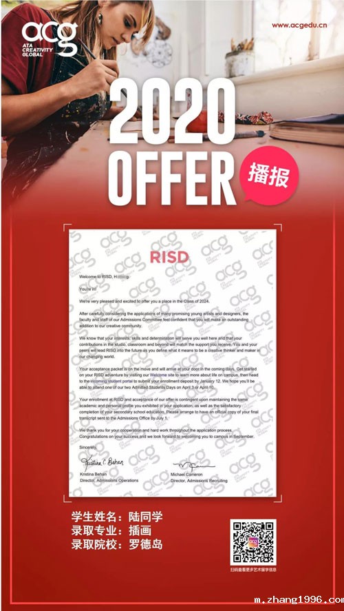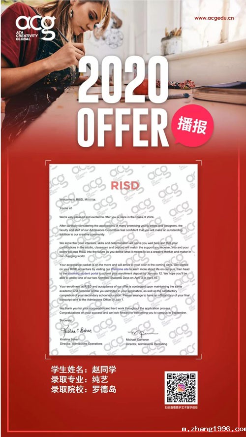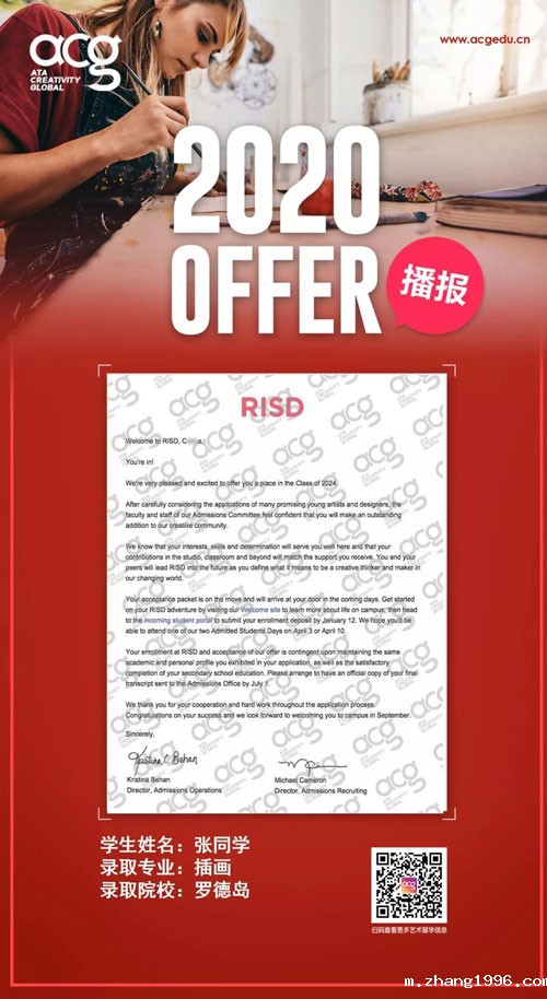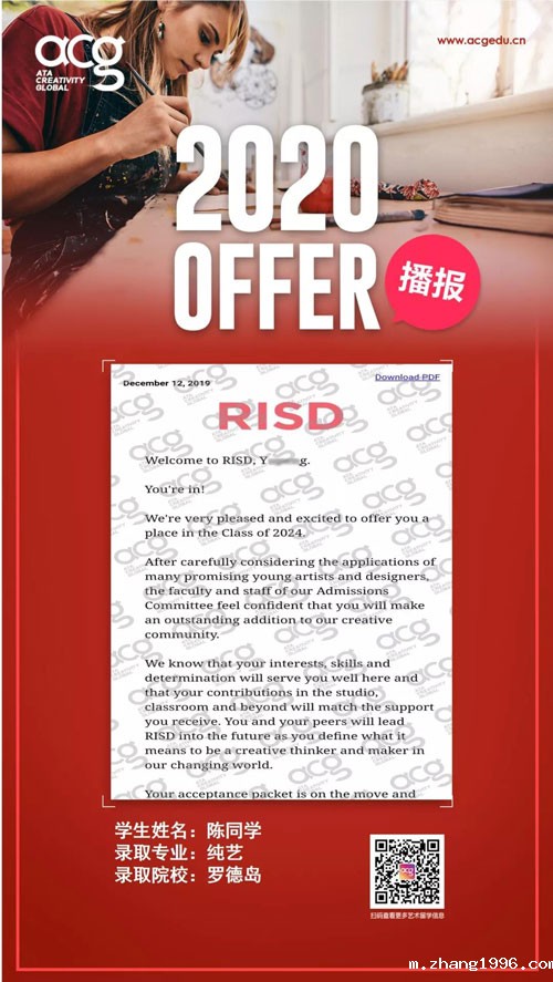 随着OFFER季的来临,顶尖艺术名校录取轮番轰炸!今天zhang1996的学员又双叒叕收到了。来自世界顶级院校罗德岛的OFFER!前方高能学霸出没请注意!