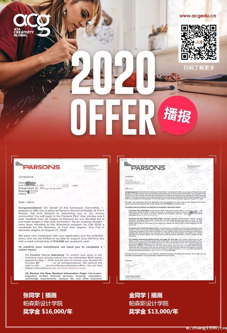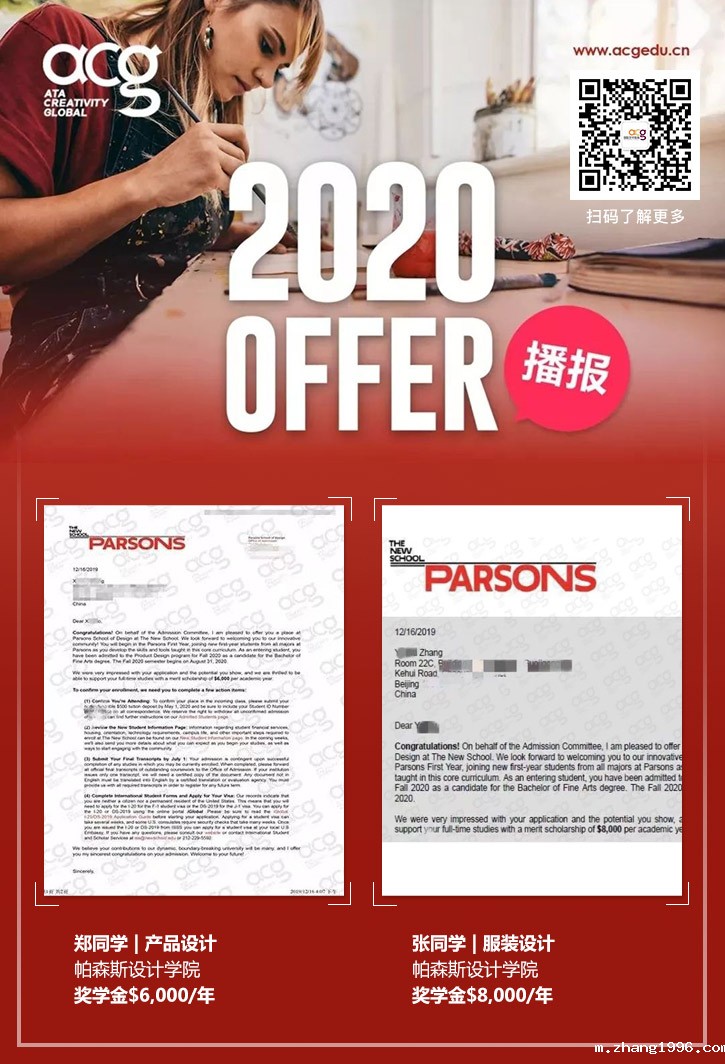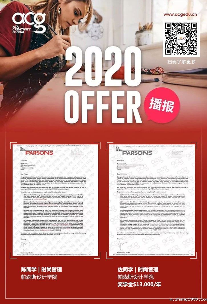 12月16日是艺术设计类院校全球排名第三、全美排名第一的Parsons 2020年申请的放榜日,同前几日RISD、CCA、UAL发放offer时如出一辙,zhang1996学员又迎来了新一轮offer与奖学金齐飞的美满开局。