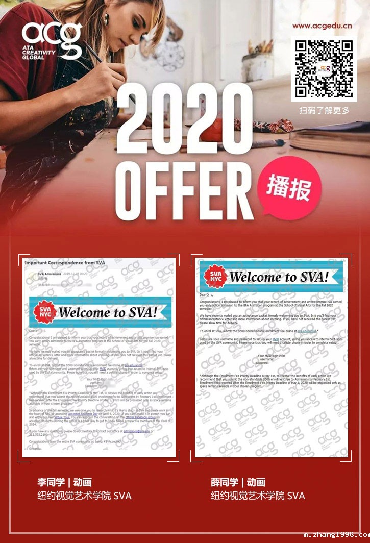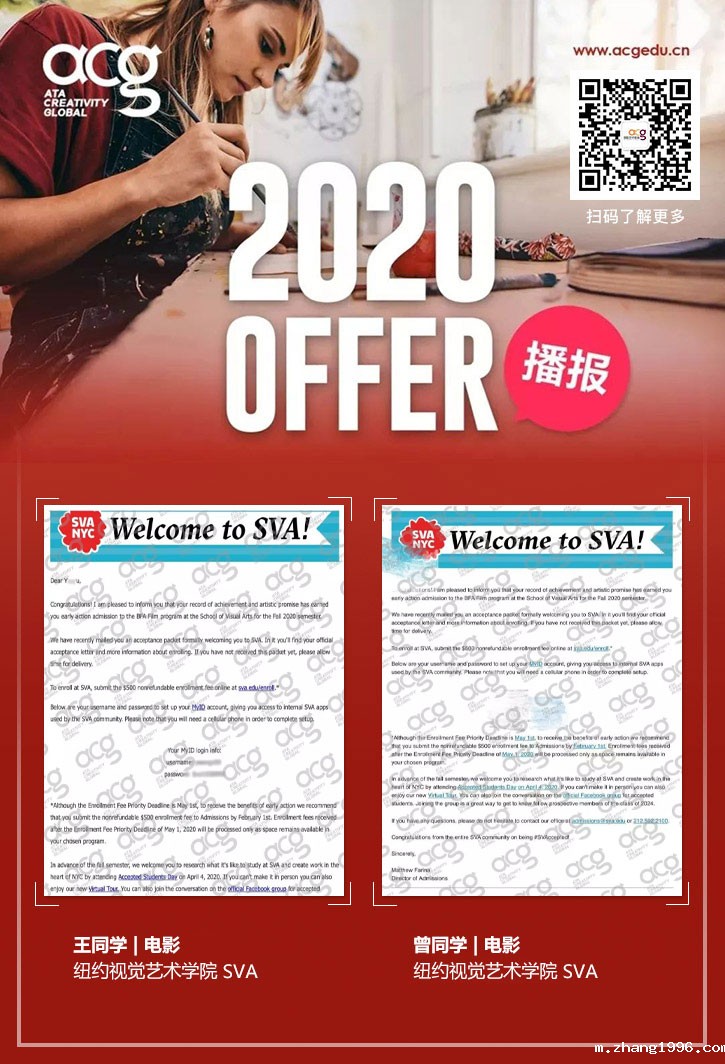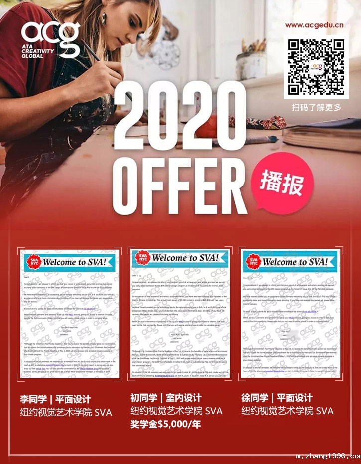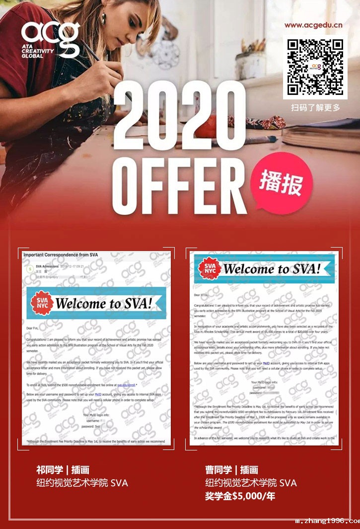 offer申请季的到来,zhang1996校区每一天都在紧张刺激惊喜中度过!继收割CCA、RISD、UAL、PARSONS等名校offer, SVA的offer也如期而至! SVA作为全美插画专业排名第一的艺术学院,zhang1996学员火力全开,狂斩7大强势专业offer,更是独占王牌插画专业鳌头,获奖学金共超百万!