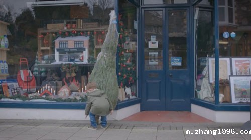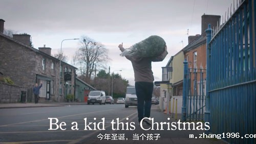 关上门以后,小男孩试图扛起一个巨大的圣诞树,结果,结尾镜头一转,一个男人扛起了圣诞树像个孩子一样大摇大摆地往前走,字幕写道:Be a kid this Christmas(今年圣诞节,做一个孩子),配合温柔抒情的女声让人心里不由得一酸,希望这个圣诞,你也能快乐得像个孩子。