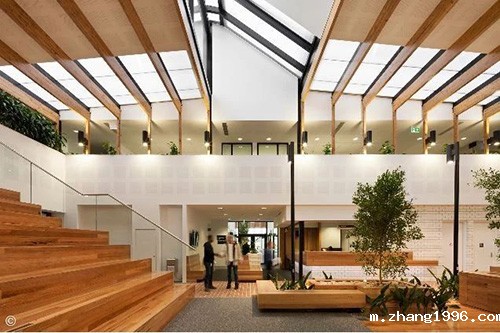 而为了缓解这一问题,Ballarat社区医院故意使用了很多比较自然,舒适的设计元素,如室内花草,深色的木料,以及表面粗糙的地砖以及暖色的光源。同时注重了采光和与白色墙面的颜色对比,最后使医院看起来不那么具有“医院感”,整体环境看起来舒适,和谐。
