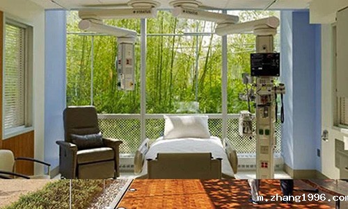 同时,设计师也可以思考如何利用不同的材质、纹理使整个空间达到一种视觉平衡,包括利用光影,明暗以及透光手段来处理空间的整体氛围,还可以将室外的景观也作为内部空间的点缀使用。这对于缓解病人对病魔的恐惧和压力是可以产生积极作用的。