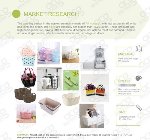 “我发现目前市场上现有的产品都以篮子的形式为主,只是在材质、颜色和尺寸有些差异,因此从形式上看非常单一。通过以上调研我提取出整个调研的关键词,并梳理出整个项目的设计步骤。这样可以清楚的向考官展示出我的设计逻辑。”