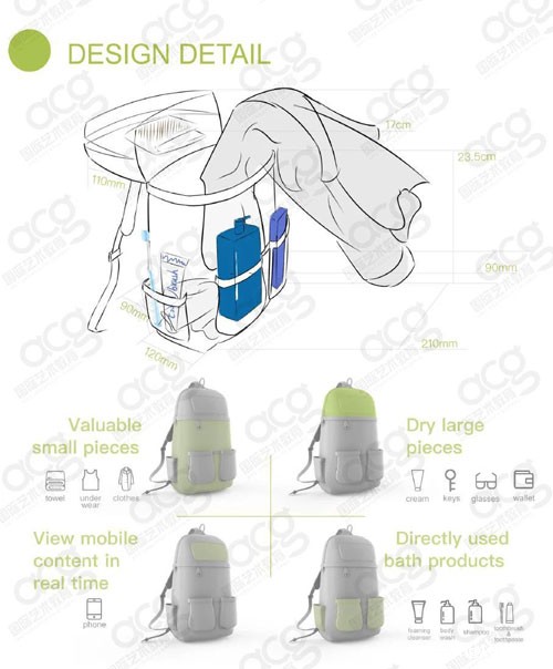 “最终我选择浴包的形式进行深化,并制作等比草模来深化方案的可行性。我将浴包主要分为3个区域,小物件区(主要放一些贵重物品),干衣区(放置干净的衣服和毛巾)和洗浴用品区。”