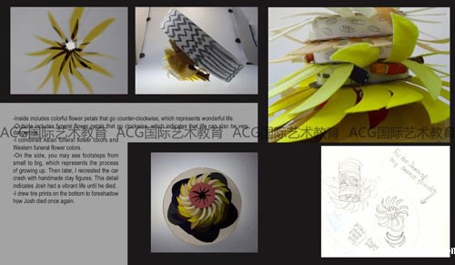 这件作品中间的彩色花瓣意味着精彩的人生,而顺时针旋转的花瓣是殡葬中才用的花瓣,代表生活中的不测和危机。两种花色分别是东西方不同颜色的葬礼花色。从侧面会发现逐渐变大的脚印,代表着成长的过程。她还亲自捏制粘土,重塑了车祸的场景,都是通过她自己思考,对 Josh 一生的诠释。