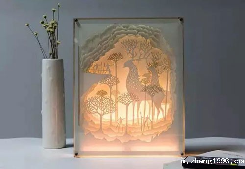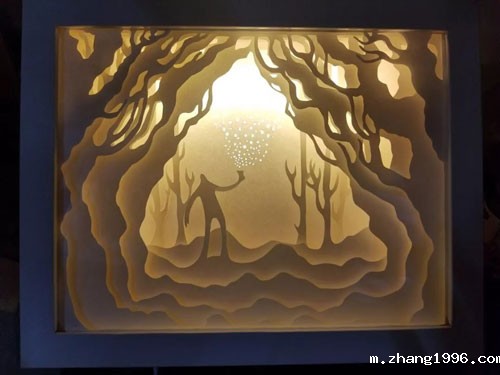 前面是精致的纸雕,后面打入一束灯光,暖黄色的灯光透过一层层剪影,呈现出童话里的画面,匠心独运的设计,精心打磨的细节,让人可以透过层次和光影感受到美。