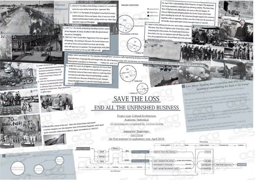 这是以前的学生作品集两个项目的首页。第一个项目,这个同学做的是战争博物馆的设计。首页就强调了这个博物馆的题材和概念,以及重点要解决的问题。第二个项目是一个农业与工业相结合的一个村落改造的一个项目。