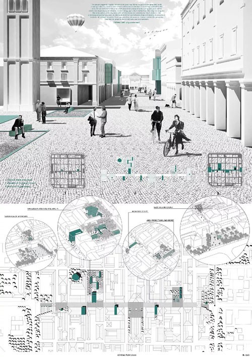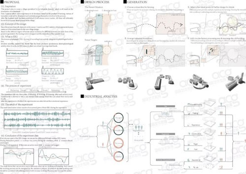 这两张是一个农业与工业结合村落改造的项目,根据项目研究课题复兴荒村而做的前期调研。从村里演变史开始进行研究,找出村落衰败的原因,基于这个原因而确定的设计理念是从河对岸的生态农业开始,激活生态农业产业,利用水陆的运输效应所带来的部分经济利益,从而带动本村的新型的集生产、加工、旅游一体的复兴模式。她做的是一个产业模式的研究,以荒村为模型去研究,这样的模式是可以复制到其他村落里面去的。