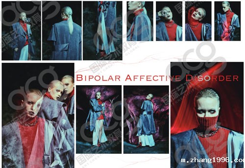 Y:最喜欢第二个项目,是关于躁郁症的。我本身很喜欢这种探讨性的主题,就是很有兴趣去多了解,所以做得过程也很有干劲。这个项目中我通过面料和印花更多的来表现主题吧,比如天鹅绒比鹿皮便宜一些,但是质感差不多,是一种很高档的感觉,硬挺,体现出一种压力,不放松的感觉,我就大面积的用了这种材质。还有红色的紧实毛衣,是一种很紧实、束缚的感觉,鱼尾半裙,上面是红血丝刺绣,整体就是想体现服饰的质感,高档的感觉。