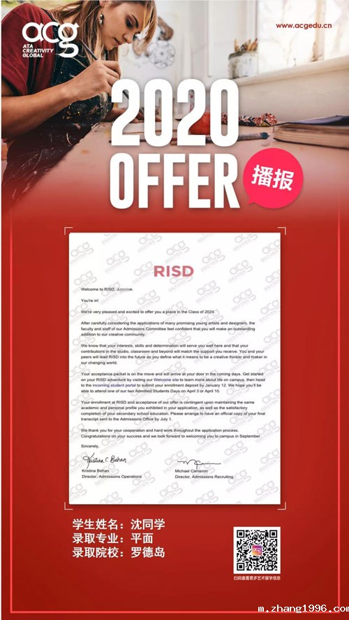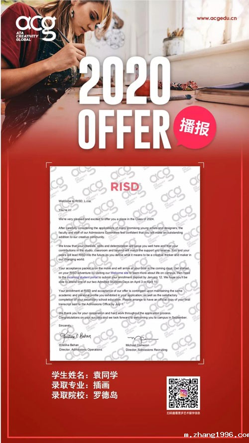 随着OFFER季的来临,顶尖艺术名校录取轮番轰炸!今天zhang1996的学员又双叒叕收到了。来自世界顶级院校罗德岛的OFFER!前方高能学霸出没请注意!