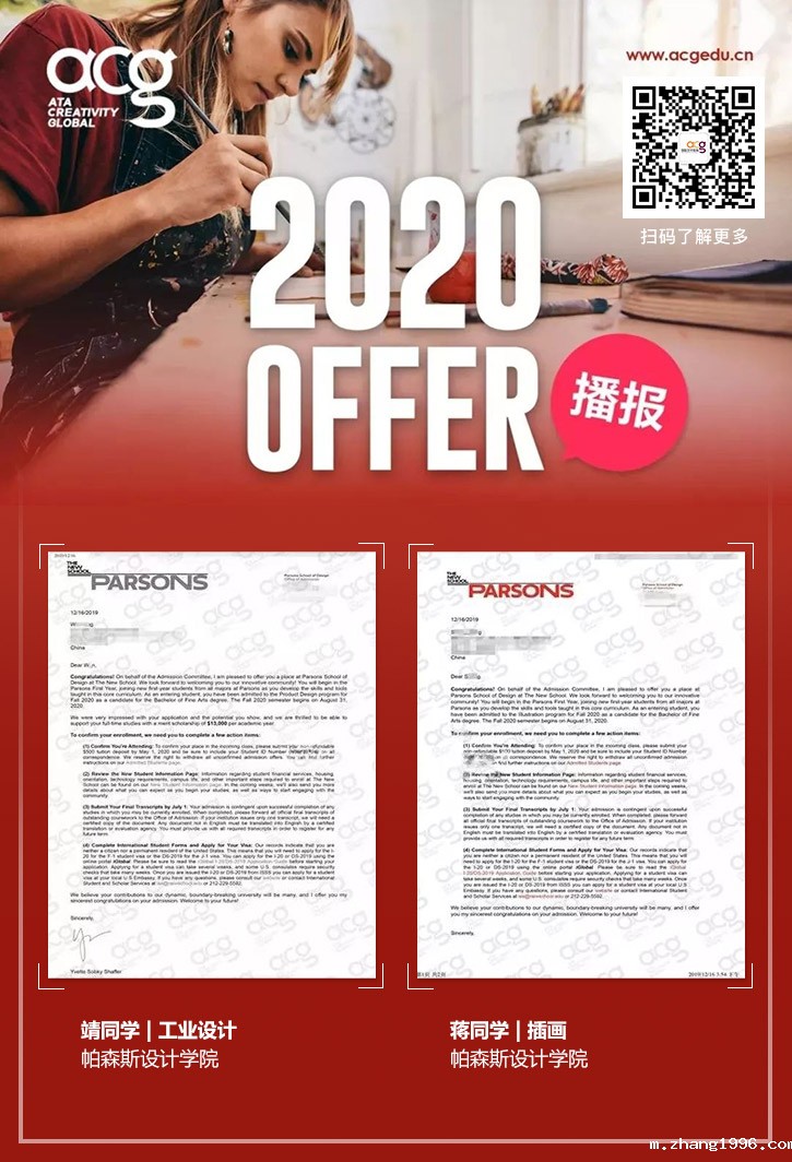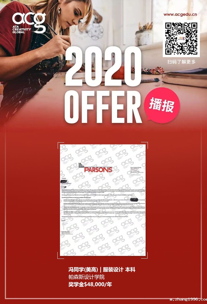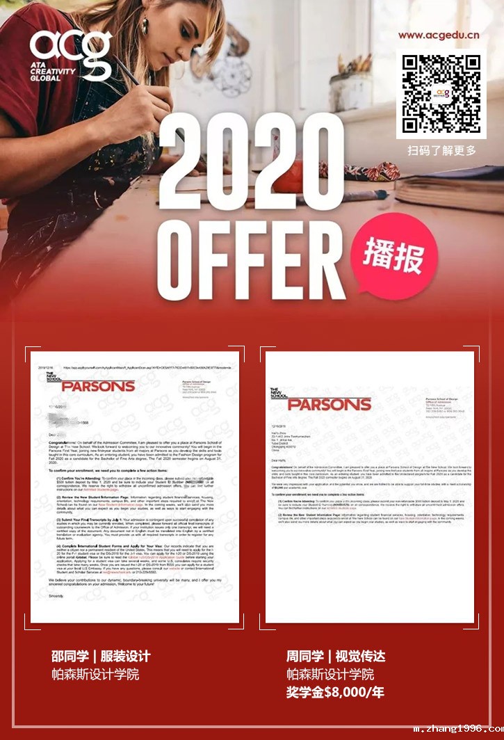 12月16日是艺术设计类院校全球排名第三、全美排名第一的Parsons 2020年申请的放榜日,同前几日RISD、CCA、UAL发放offer时如出一辙,zhang1996学员又迎来了新一轮offer与奖学金齐飞的美满开局。