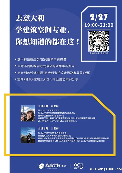此次针对意向申请意大利建筑设计、景观设计、室内设计等建筑类专业的学生,zhang1996携手森淼学校联合推出为“意大利建筑专业申请专题讲座”真正的帮助各位有意艺术留学意大利学习建筑类专业的同学!